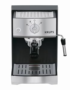 Product Description : Amazon.com Product Description : Beautifully housed in brushed stainless steel with black accents, this user-friendly espresso machine not only looks great on the kitchen counter, but it also makes it possible to brew cafe-quality coffee drinks from the comfort of home. The machine features a 15-bar pump and fast-heating 1400-watt thermoblock heating system, which ensure optimal temperature control and high-pressure brewing for perfect extraction with excellent crema. Even more, the brewing system pre-heats twice as fast and resists lime-scale buildup (less descaling needed). Choose from ground coffee, E.S.E. pods, or soft pods thanks to the included universal coffee filter holder, which clicks into place for one or two cups. The espresso machine also comes equipped with foolproof Precise Tamp technology, which automatically tamps coffee grounds evenly to the optimum level, directly against the brewing head to minimize puddling and tunneling. After brewing espresso, turn the manual selector knob from brew mode to frothing-milk mode to effortlessly create creamy cappuccinos, lattes, and more. The machine's mess-free cake-ejection system, redesigned multi-directional frothing nozzle, and locking steam nozzle provide exceptional convenience and easy cleanup. Other highlights include a removable water tank for filling at the sink, a removable drip tray, and on-board coffee-scoop storage. A thoughtful housewarming gift idea, the espresso machine measures 9 by 10-2/7 by 11-1/2 inches and carries a one-year limited warranty. Product Description : Krups Precise Tamp patented system ensures optimum tamping each time for perfect crema and results. The precise tamp system extracts a perfect cup every time for a delicious espresso, latte or cappuccino. The 1400w thermo block system pre-heats twice as f