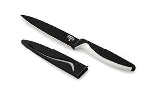 Product Description : Designed by famed Swiss designer Philipp Beyeler, the Colori Utility Knife puts the fun in functional. It has a slim 5-inch super-sharp carbon steel blade with nonstick coating that food can't cling to, a curvy profile that creates an ergonomic grip, and a sheath that keeps them sharp in the drawer. The an excellent knife for mincing, chopping, slicing and dicing.