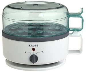 Product Description : Amazon.com ReviewThis cooker boils up to seven eggs at one time or poaches one or two eggs in trays. You can use the calibrated water-level indicator to pour the precise amount of water needed to soft-, medium-, or hard-boil one to seven eggs. The indicator (a tube) has a steel pin in the bottom for piercing eggshells; this will leech out the sulfur so yolks remain yellow during cooking rather than turning green. Assuming the proper amount of water is in the egg holder, the timer will ensure the eggs are cooked to the desired level, and then indicates with a light and bell when the hard-boiling is completed. You can then set the timer switch to keep the eggs warm. The plastic egg holder is removable, letting you cool the eggs under running water. Everything cleans easily, including the nonstick coating on top of the boiling plate. The cooker measures 9-1/8 inches wide and 5-1/4 inches high. --Fred Brack Product Description : Quickly boil up to 7 eggs (soft, medium, or hard) or poach up to 2 eggs. Signal indicates end of cooking cycle. Lid and egg holder are dishwasher safe for quick clean up. Dual switch for boiling and keep warm setting. Removable egg holder facilitates cool